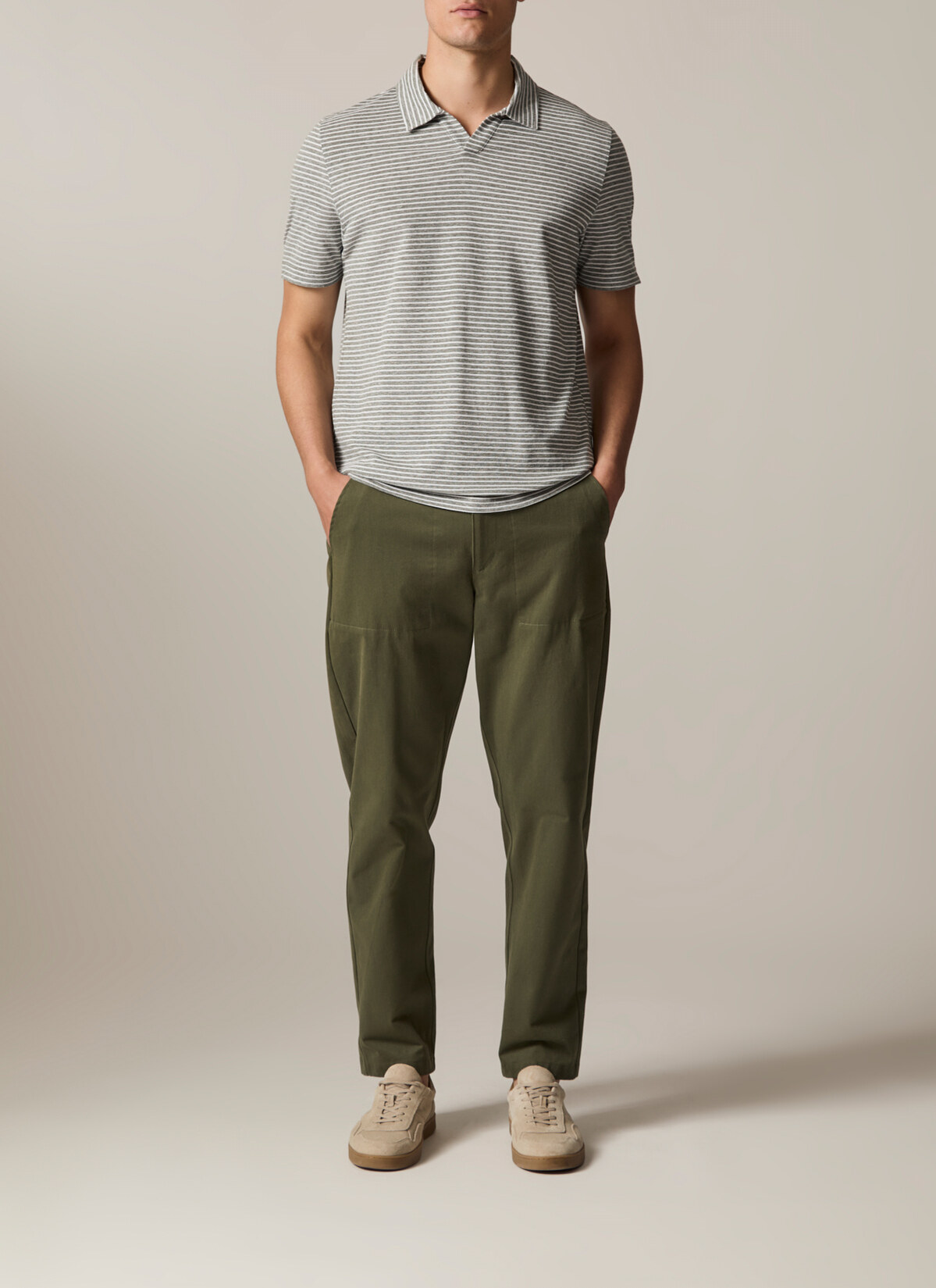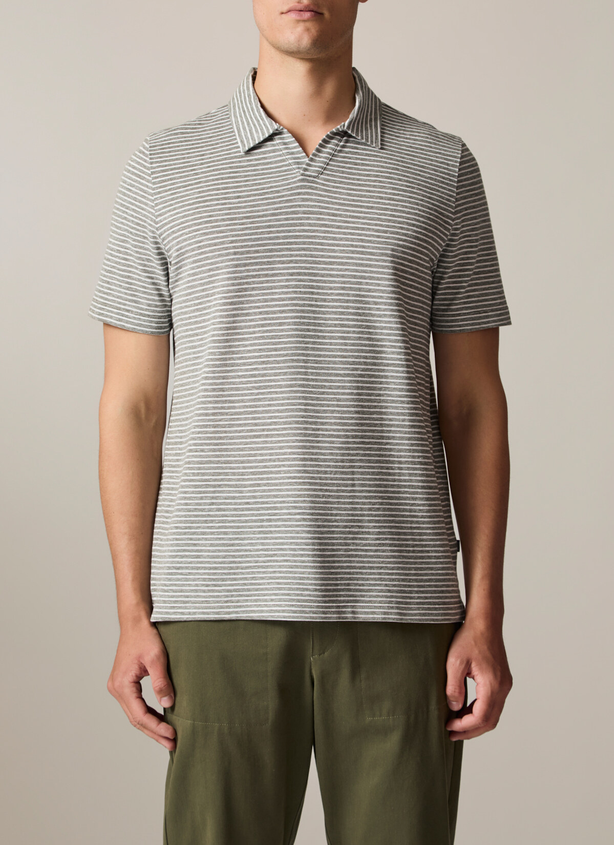 Das Polo zeigt sich im Regular Fit mit dezentem, offenem V-Ausschnitt. Material: die Baumwoll-Leinen-Mischung kombiniert die Atmungsaktivität der Baumwolle mit der kühlenden Leichtigkeit von Leinen für optimalen Komfort bei warmem Wetter. Optik: Das Streifenmuster verleiht dem Polo eine moderne und gleichzeitig zurückhaltende Ausstrahlung. Haptik: griffig und angenehm weich auf der Haut an. Styling-Tipp: Kombiniert mit einer schlichten Chino oder Jeans entsteht ein klassischer, dennoch zeitgemäßer Look.