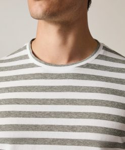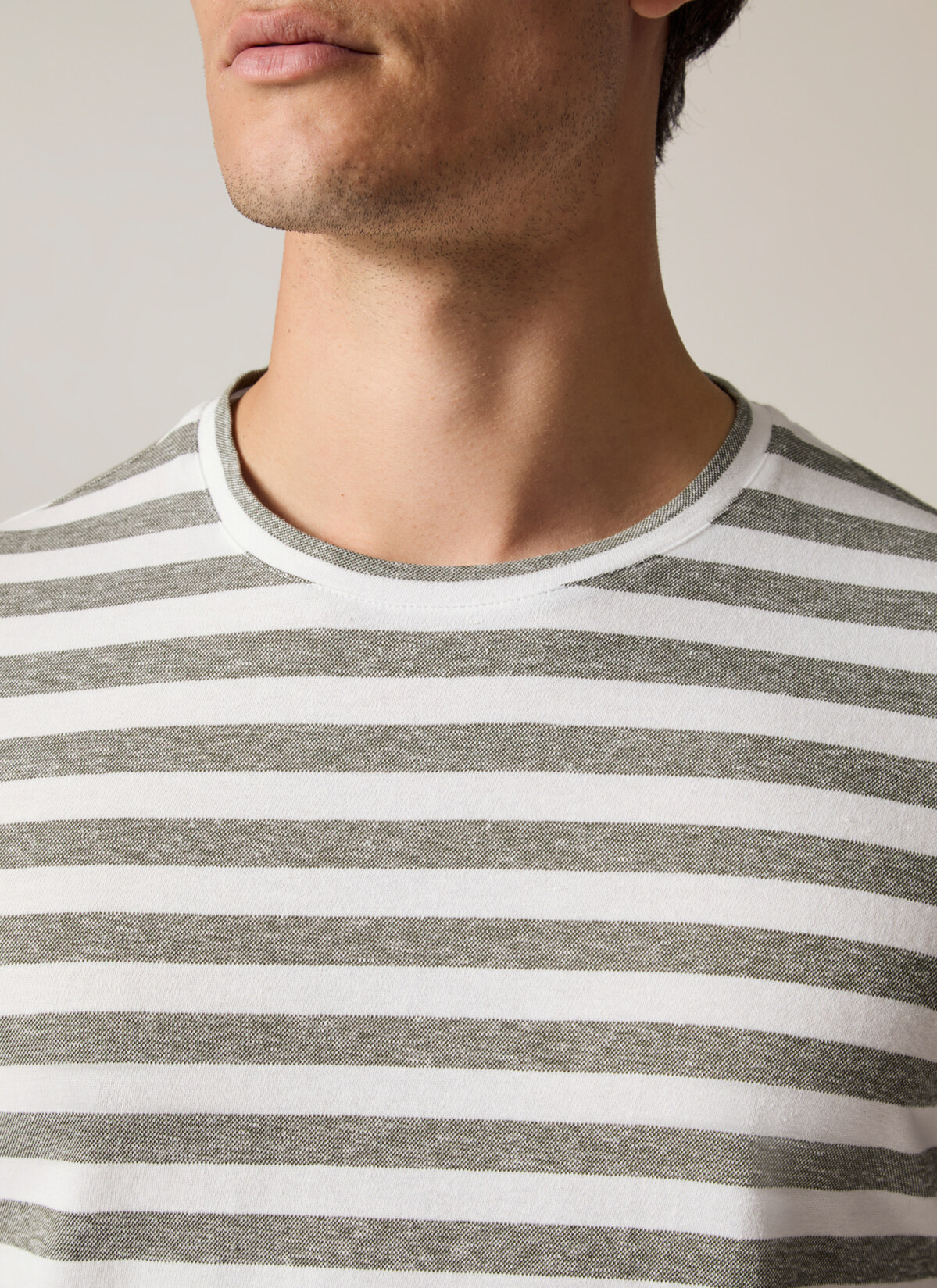 Das T-Shirt im Modern Fit präsentiert sich mit dezenten, horizontalen Streifen, die dem klassischen Design eine moderne Note verleihen. Material: gefertigt aus einer weichen Mischung aus Baumwolle und Leinen, bietet es einen hohen Tragekomfort, ist atmungsaktiv, leicht und feuchtigkeitsregulierend. Haptik: leicht und kühl. Styling-Tipp: Perfekt kombiniert mit einer lässigen Jeans oder Shorts für einen entspannten, aber eleganten Look.