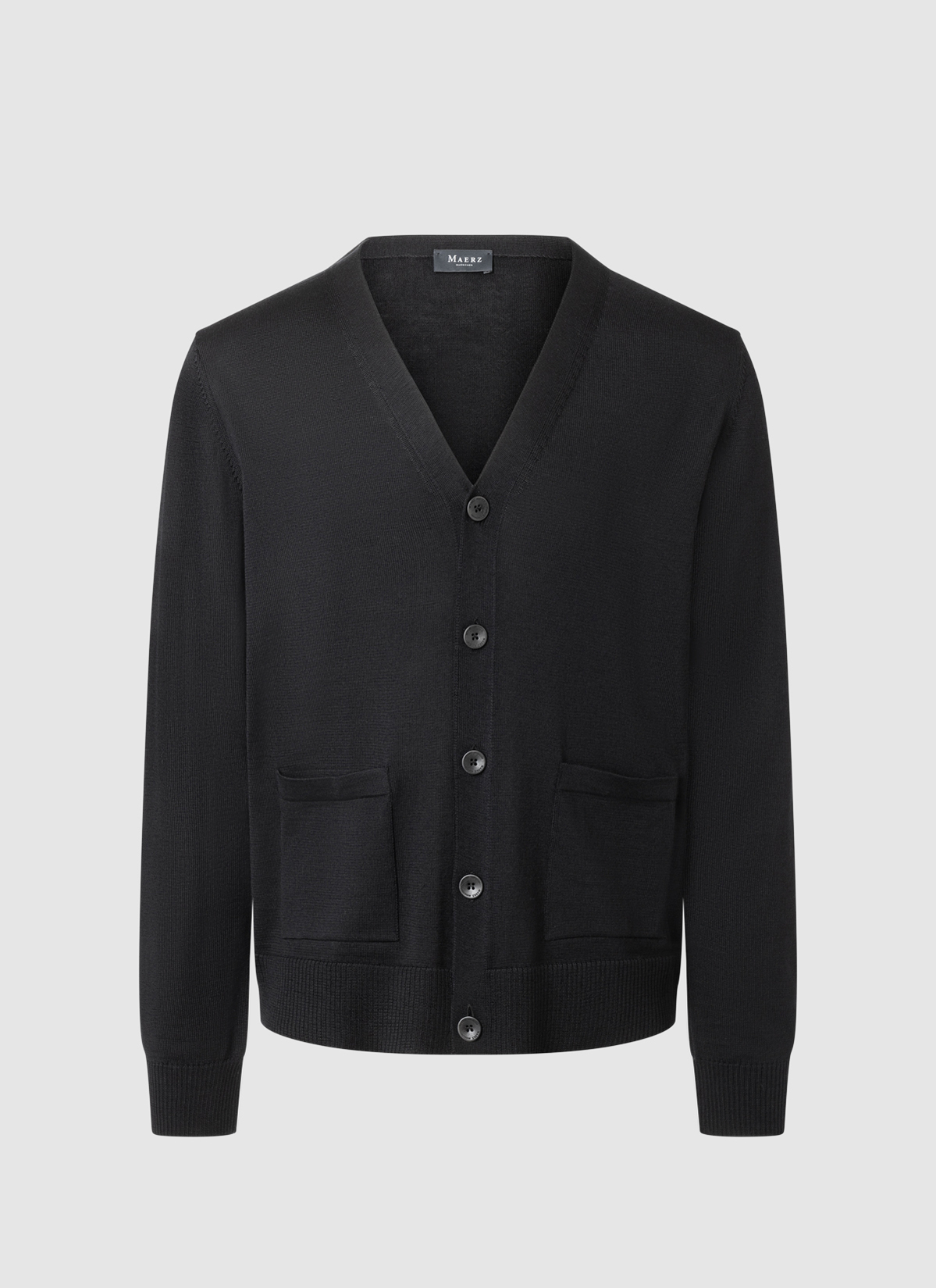 Zeitloser Stil in reiner Merinowolle – diese Strickjacke vereint klares Design mit funktionalem Komfort. Mit V-Ausschnitt, aufgesetzten Taschen und einem bequemen Regular Fit ist sie ein vielseitiger Klassiker für jeden Tag. Merinowolle sorgt für hohen Tragekomfort, wirkt feuchtigkeitsregulierend, geruchsneutral und bietet natürliche Wärme bei gleichzeitigem Temperaturausgleich. Das Maschenbild ist klassisch und gleichmäßig, der Griff weich und angenehm. Handgekettelte Nähte und elastische Bündchen stehen für erstklassige Verarbeitung, das Tragegefühl ist leicht und wärmend zugleich.