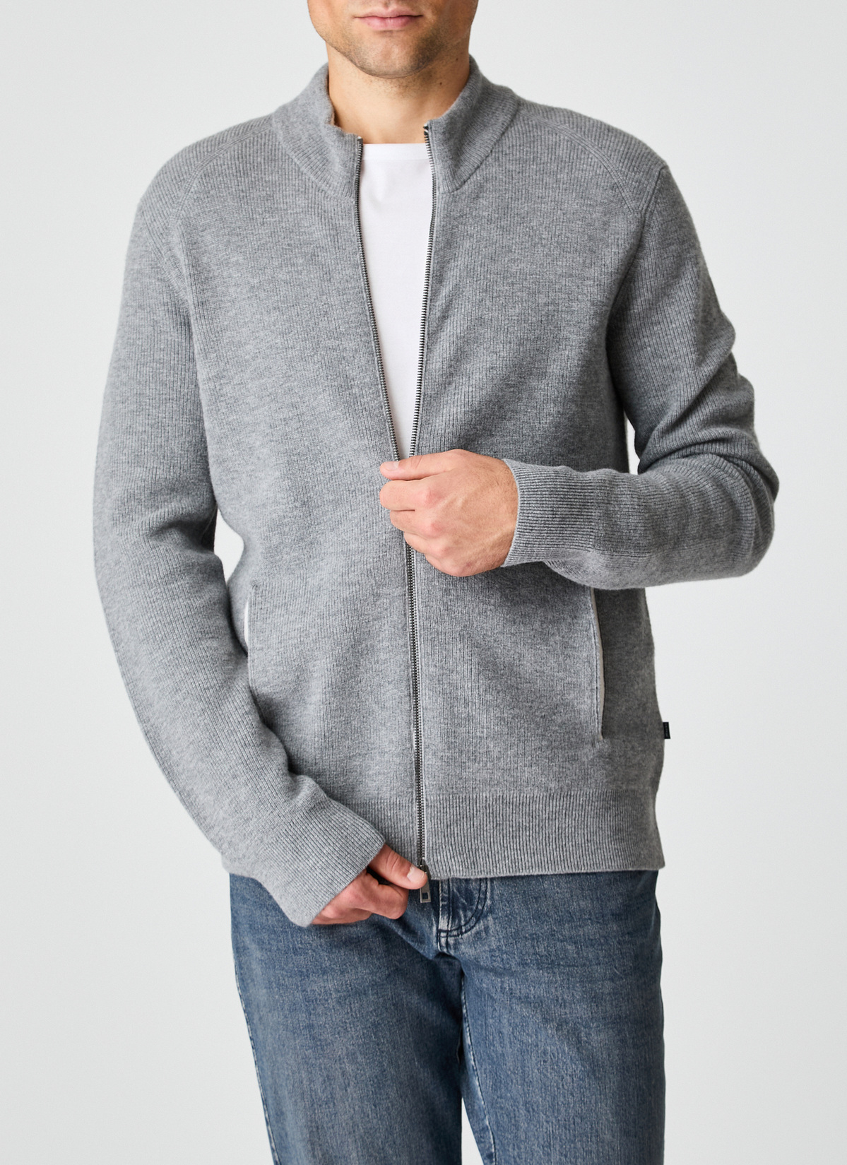 Diese edle Herren-Strickjacke aus 100% feinster Merinowolle vereint zeitlose Ästhetik mit außergewöhnlichem Tragekomfort. Die hochwertige, temperaturausgleichende Naturfaser fühlt sich angenehm weich auf der Haut an und überzeugt durch ihre langlebige Qualität. Ein markanter Stehkragen, der elegante Zwei-Wege-Reißverschluss und zwei dezent eingearbeitete Eingriffstaschen verleihen dem Modell eine gepflegte, maskuline Ausstrahlung. Der reguläre Schnitt sorgt für eine bequeme, formstabile Passform und unterstreicht den klassischen Charakter des Designs. Ein vielseitiger Begleiter, der klassisches Design mit luxuriösem Material verbindet.