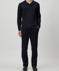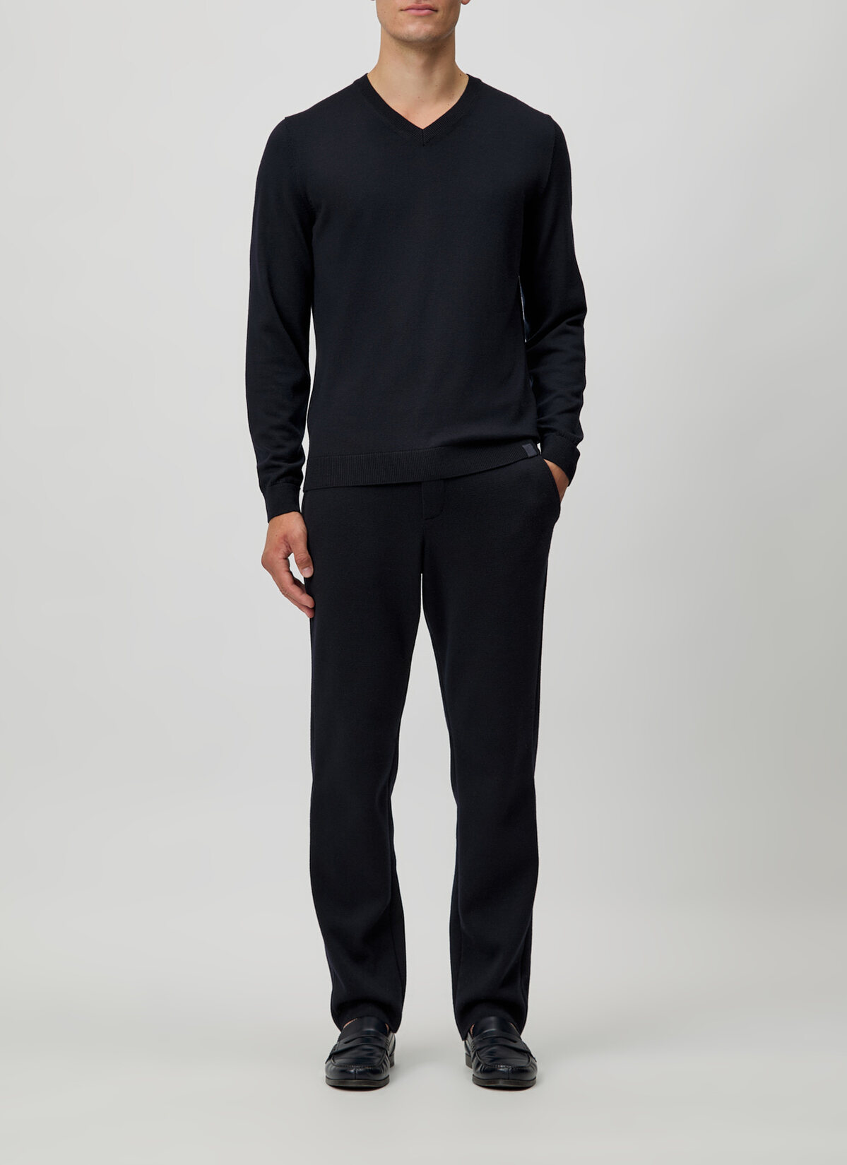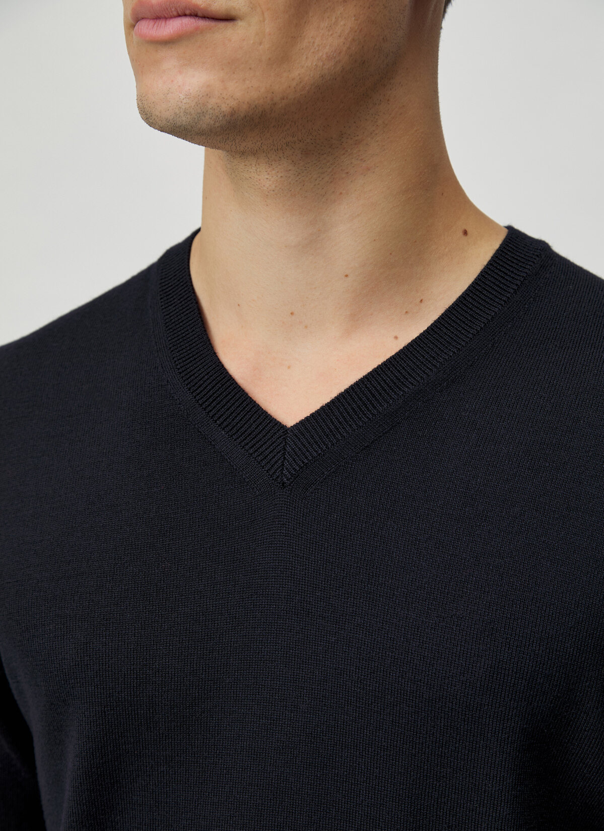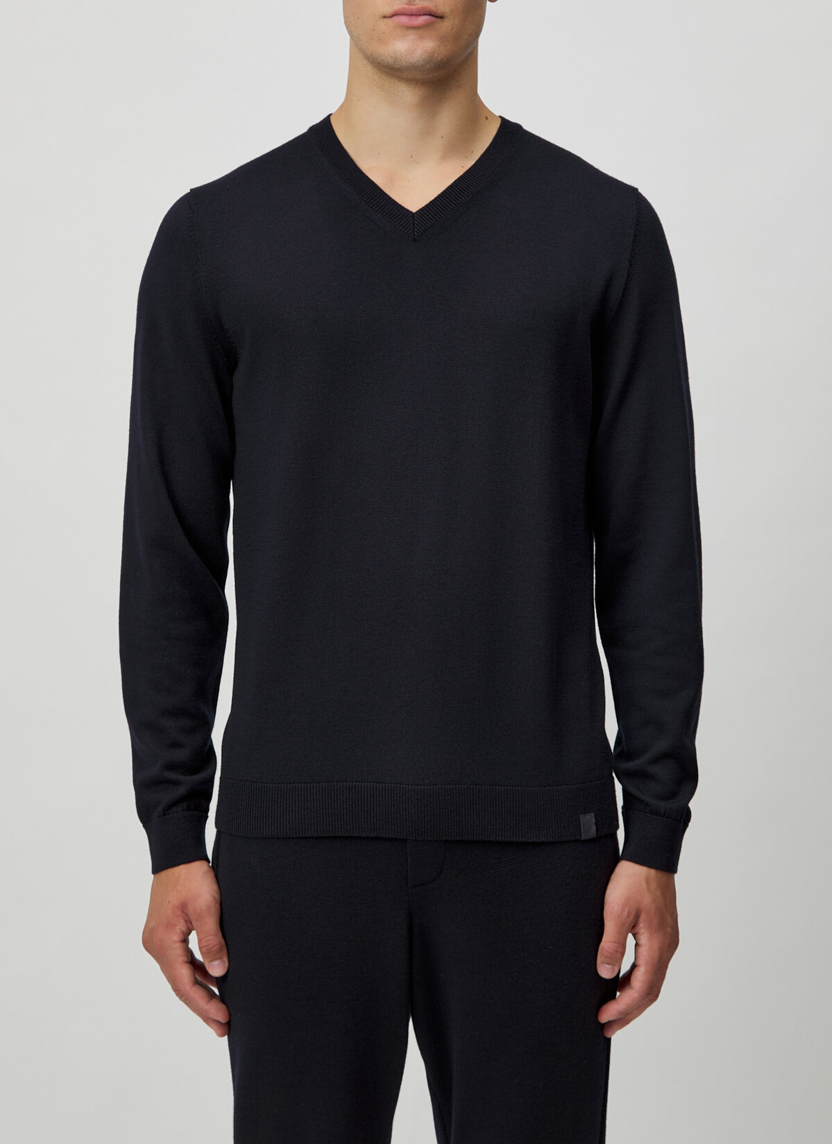 Sportiv und vielseitig: moderner Pullover mit V-Ausschnitt im Modern Fit. Besonders: die nachaußengedrehte Naht und die aufwendigen Strickdetails an Schulter und Kragen. Material: fein und weich, aber enorm strapazierfähig, mit einem festen und gleichzeitig elastischen Griff.Haptik: cleanes klassisches Maschenbild mit weichem Wollgriff. Hochwertige Verarbeitung mit handgekettelten Nähten und elastischen Bündchen.