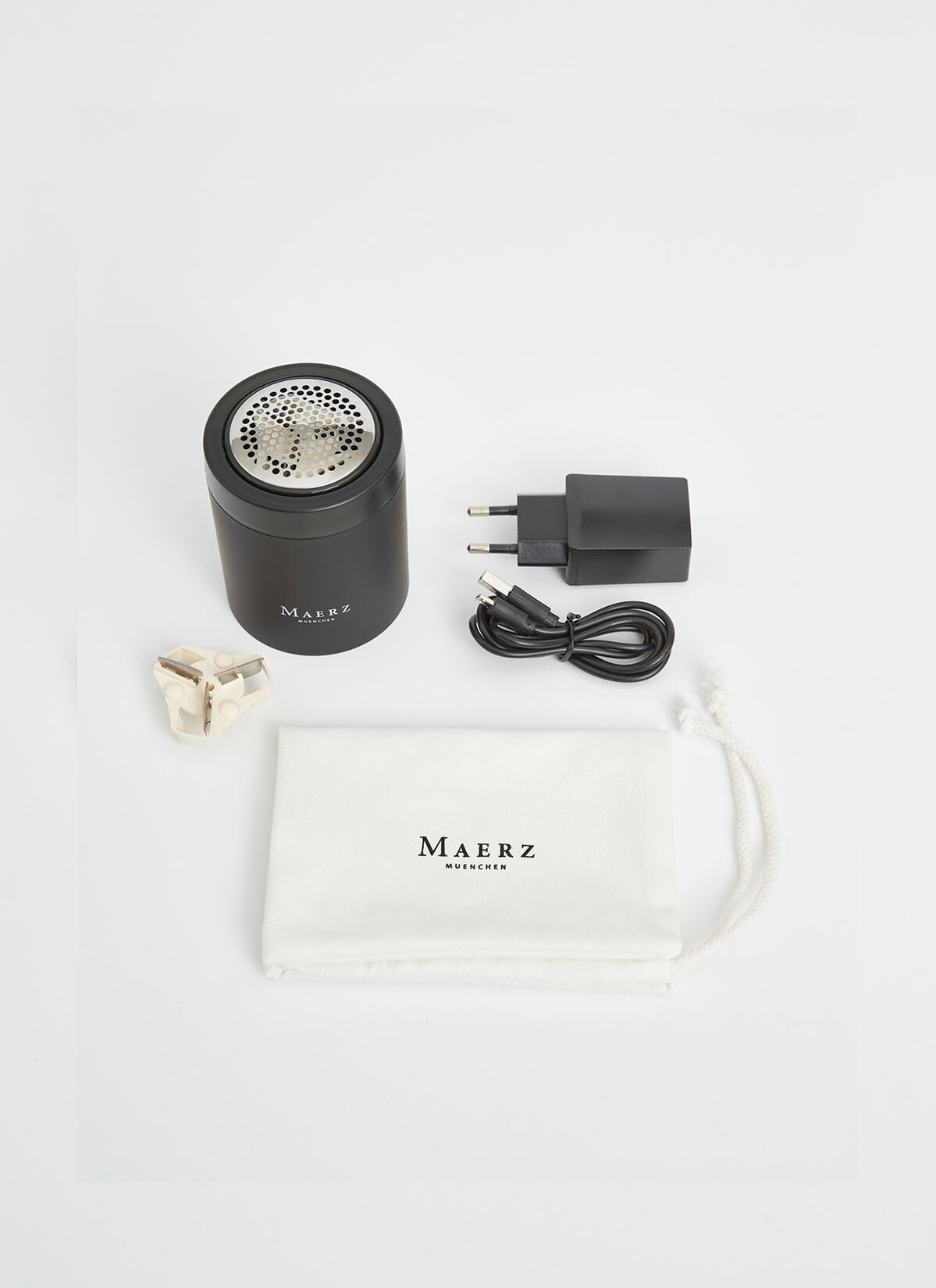 Der neue MAERZ Muenchen Knit Shaver ist da! Das überarbeitete kabellose Modell in Mattschwarz besticht durch die neue zylinderförmige Passform und ein kompaktes, griffiges Design. Dadurch liegt der Fusselrasierer toll in der Hand und stellt so eine besonders komfortable und unkomplizierte Bedienung sicher. So können Sie Ihre Kleidung besonders einfach von Fusseln und kleinen Knötchen befreien. Zusätzlich zum Fusselrasierer erhalten Sie ein Ladekabel mit USB-Anschluss. eine Ersatzklinge sowie einen praktischen Aufbewahrungsbeutel.
