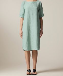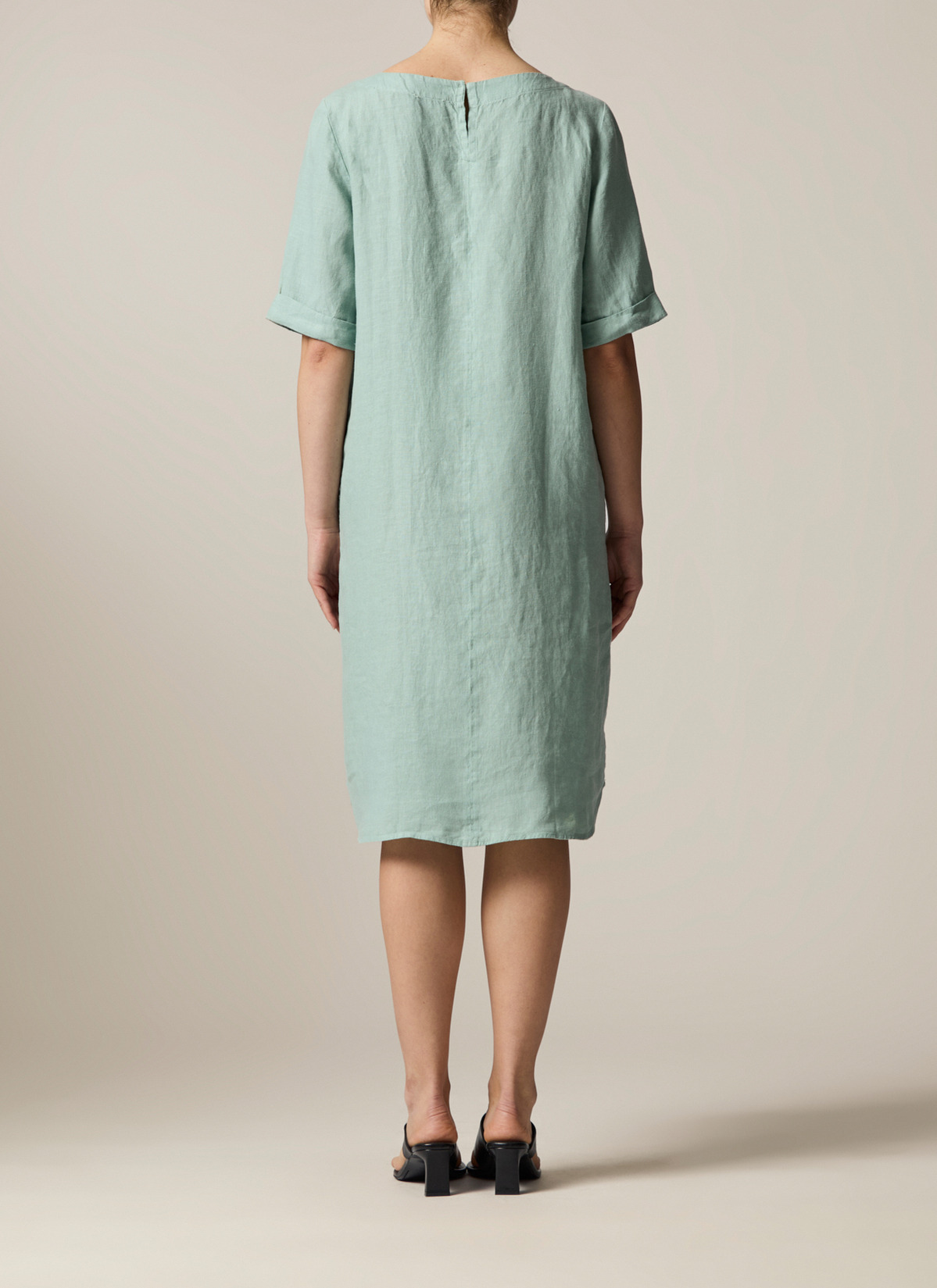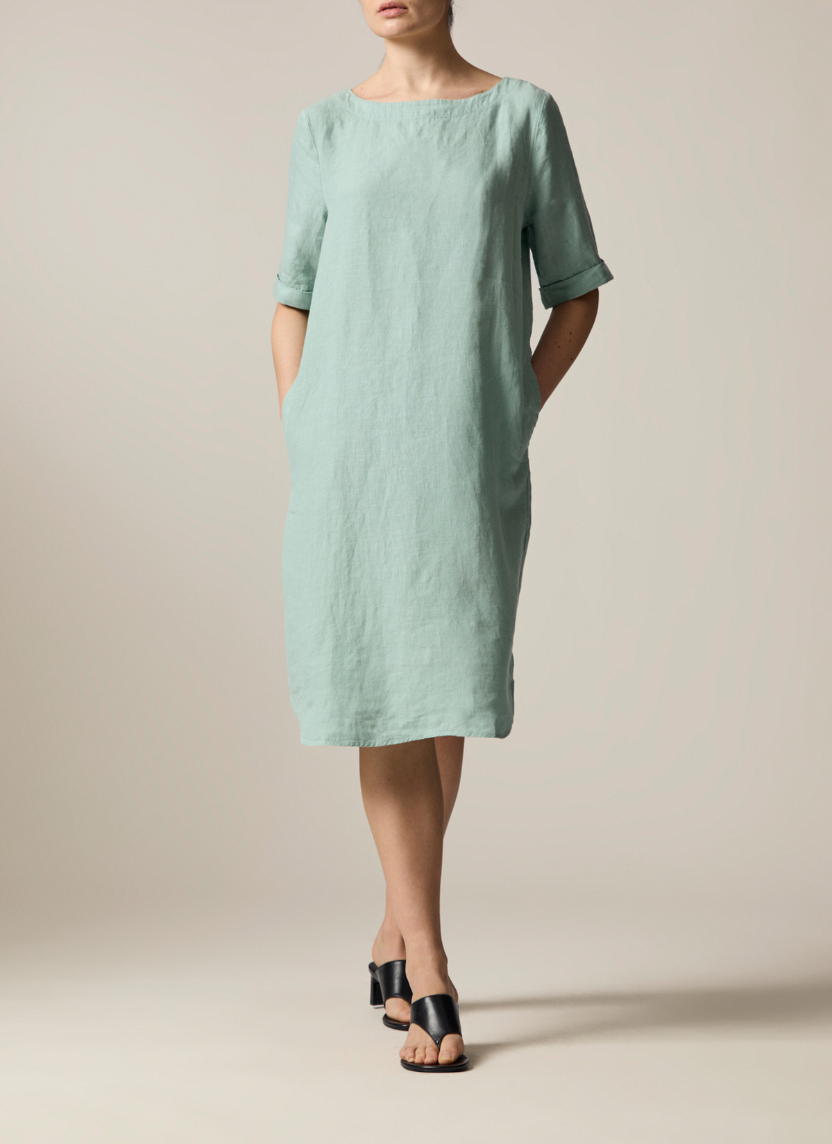 Das Kleid im entspannten Relaxed Fit zeigt sich mit Rundhalsausschnitt sowie zwei seitlichen Eingriffstaschen. Material: gefertigt aus Leinen ist das Kleid wunderbar kühlend und atmungsaktiv. Haptik: kernig und kühl im Griff. Styling-Tipp: für einen entspannten Look mit den Lieblings Sneakers kombinieren.