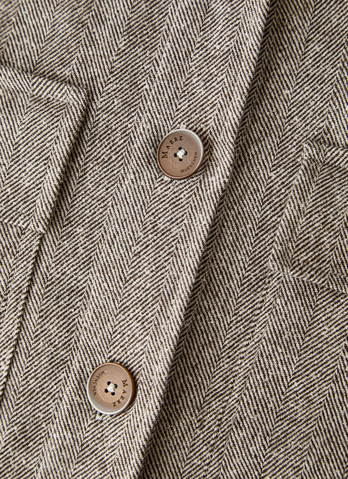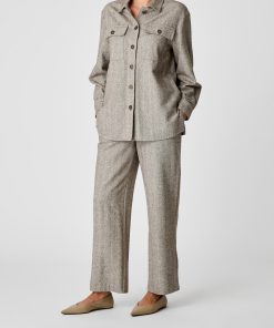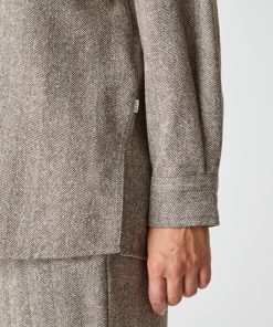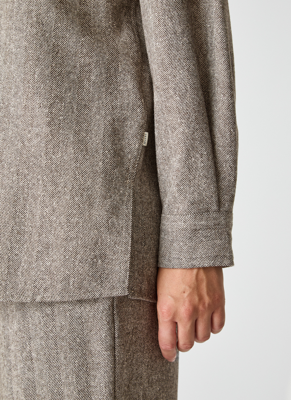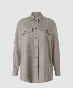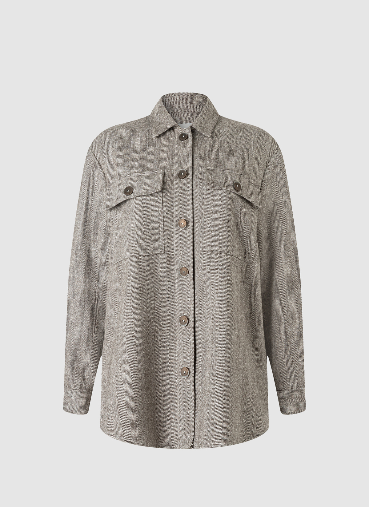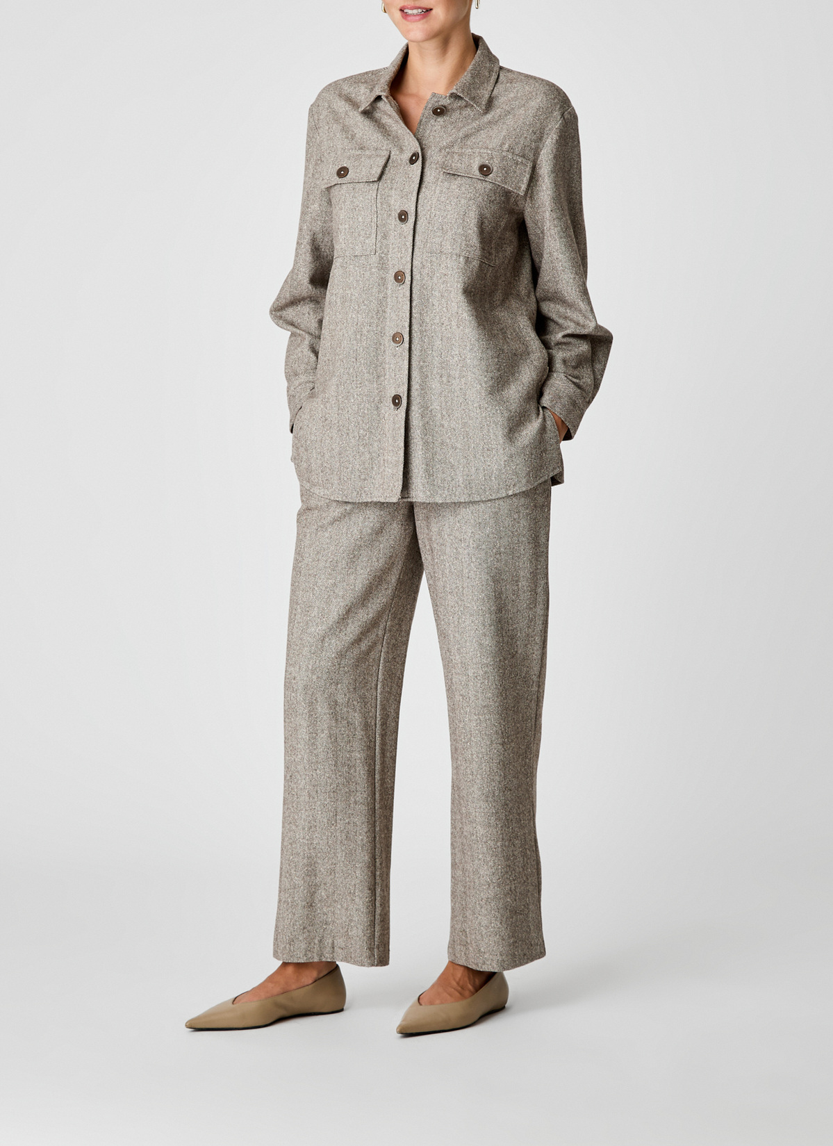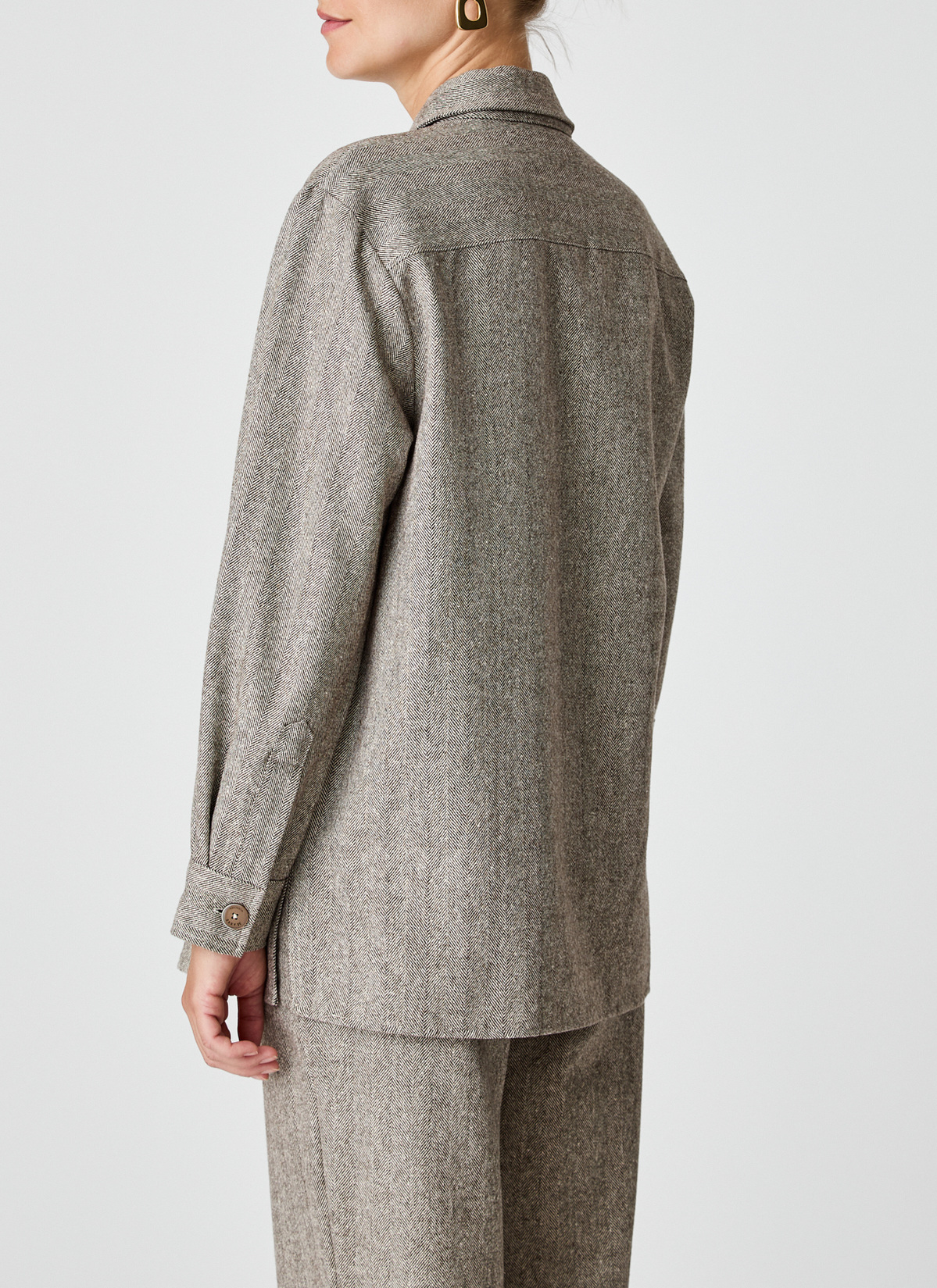 Das Overshirt mit feinem Herringbone-Muster zeigt sich in moderner Tweedoptik und einem femininen Modern Fit. Mit zwei aufgesetzten Taschen auf der Vorderseite und einer durchgehenden Knopfleiste bekommt das Modell eine klare, aber legere Ausstrahlung. Die weiche Mischung aus Wolle, Seide und Baumwolle trägt sich angenehm, ist atmungsaktiv und sorgt für ein ausgeglichenes Trageklima. Ein feiner Seidenglanz verleiht dem Stoff eine edle Note. Kombiniert im Set mit der passenden Hose (Art. Nr.: 113501) wirkt der Look besonders modern und stilvoll.