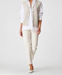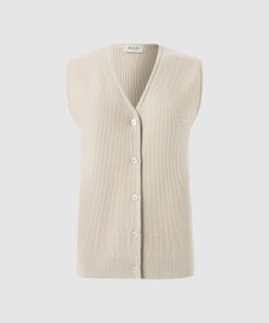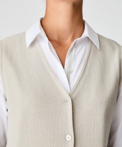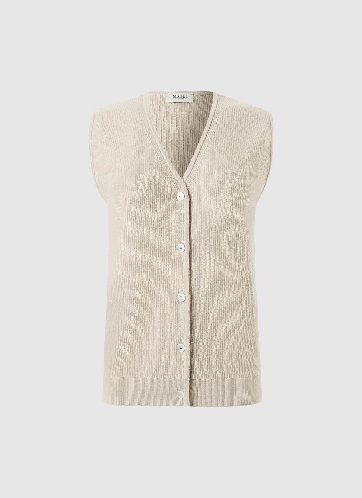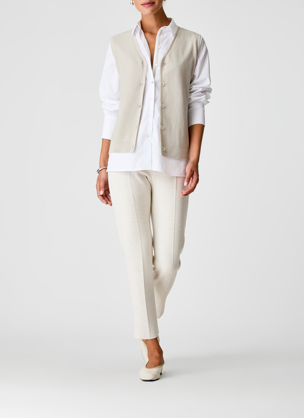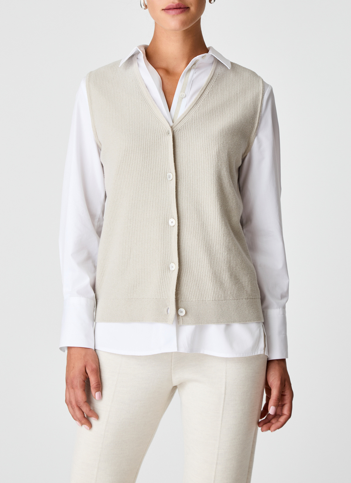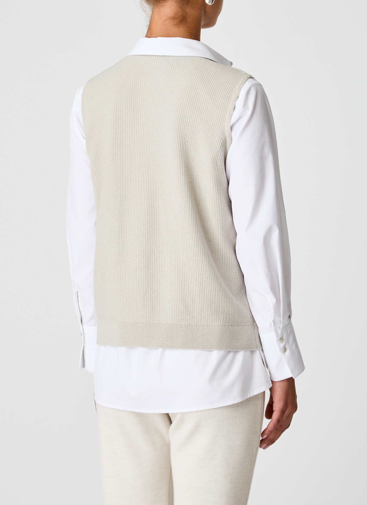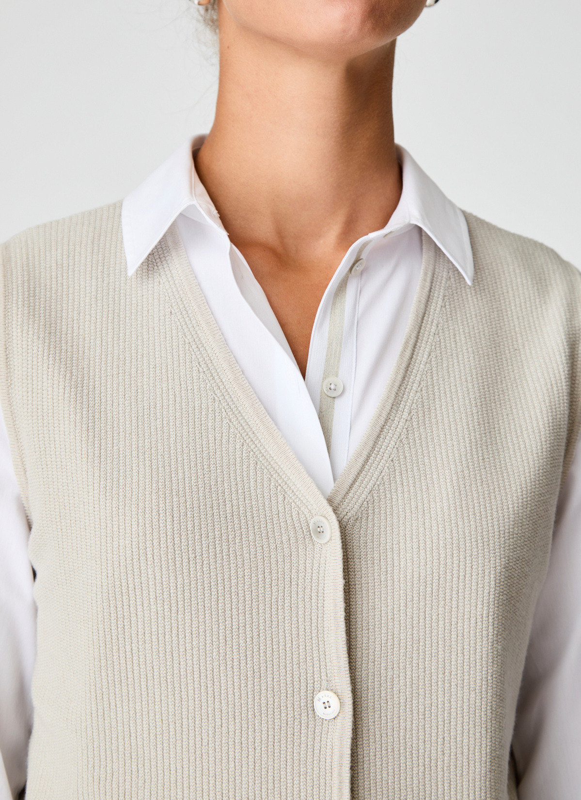 Dieser Damen Pullunder mit Rippenstruktur überzeugt durch ihr klares Design und angenehmen Tragekomfort. Der Schnitt im Regular Fit sowie der V-Ausschnitt und die durchgehende Knopfleiste verleihen eine zeitlose, vielseitig kombinierbare Silhouette. Die markante Rippenstruktur sorgt für eine moderne, strukturierte Optik. Die hochwertige Mischung aus Schurwolle und Baumwolle bietet ein natürliches Tragegefühl, ist atmungsaktiv und temperaturausgleichend – ideal für wechselhafte Tage zwischen Hochsommer und Frühherbst. Ein stilvolles Layering-Piece, das jedes Outfit aufwertet.