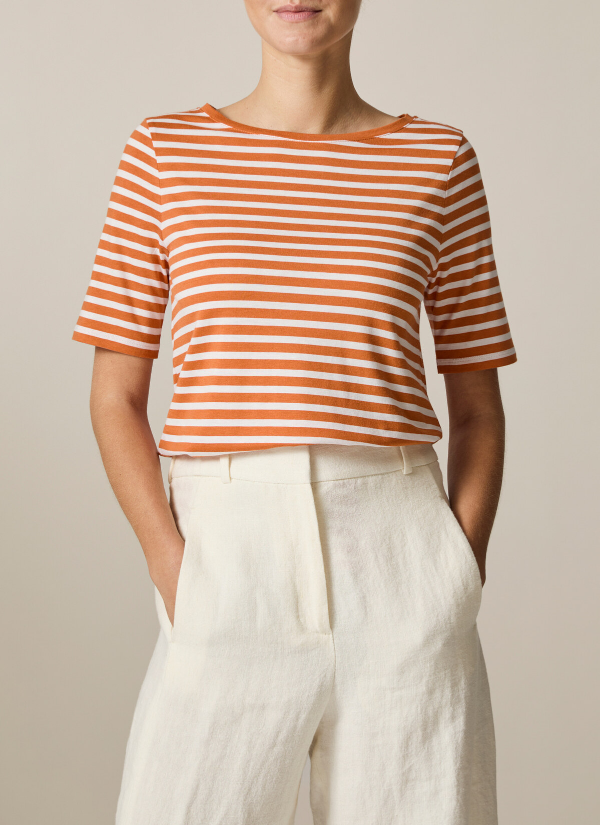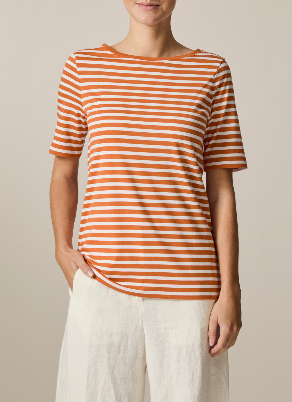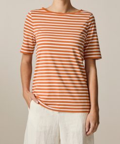 Das Streifen Shirt – eines unserer liebsten Muster-Basics. Dieses absolute Muss in jedem Kleiderschrank ist ein echtes Kombinationstalent. Es zeigt sich gerade geschnitten im Regular Fit mit klassischem Rundhalsausschnitt und halblangen Ärmeln. Material: Gefertigt aus Single-Jersey in einer Baumwoll-Modal Mischung ist das Shirt weich, atmungsaktiv und feuchtigkeitsregulierend. Haptik: glatt und angenehm auf der Haut.