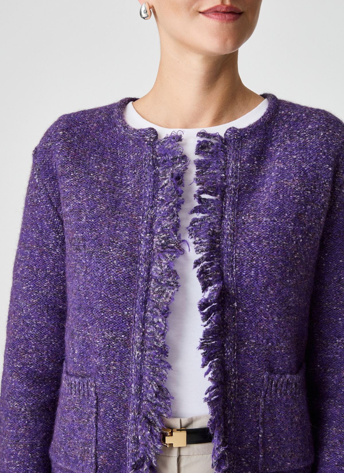 Diese hochwertige Damenstrickjacke aus einem edlen Alpaka-Baumwollmix überzeugt durch ihre weiche Haptik und natürliche Wärme. Die aufwendige Mouliné-Struktur in stilvoller Tweedoptik verleiht dem Modell eine lebendige, dennoch zeitlose Ausstrahlung. Ein klassischer Rundhalsausschnitt, dekorative Fransendetails und aufgesetzte Taschen sorgen für feminine Akzente mit besonderem Charme. Dank des feinen Phantasiegarns wirkt das Strickbild besonders ausdrucksstark und individuell. Ideal für alle, die Komfort, Qualität und stilvolle Details in einem Lieblingsstück vereint wissen möchten.
