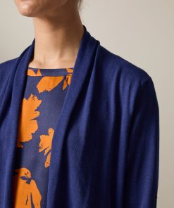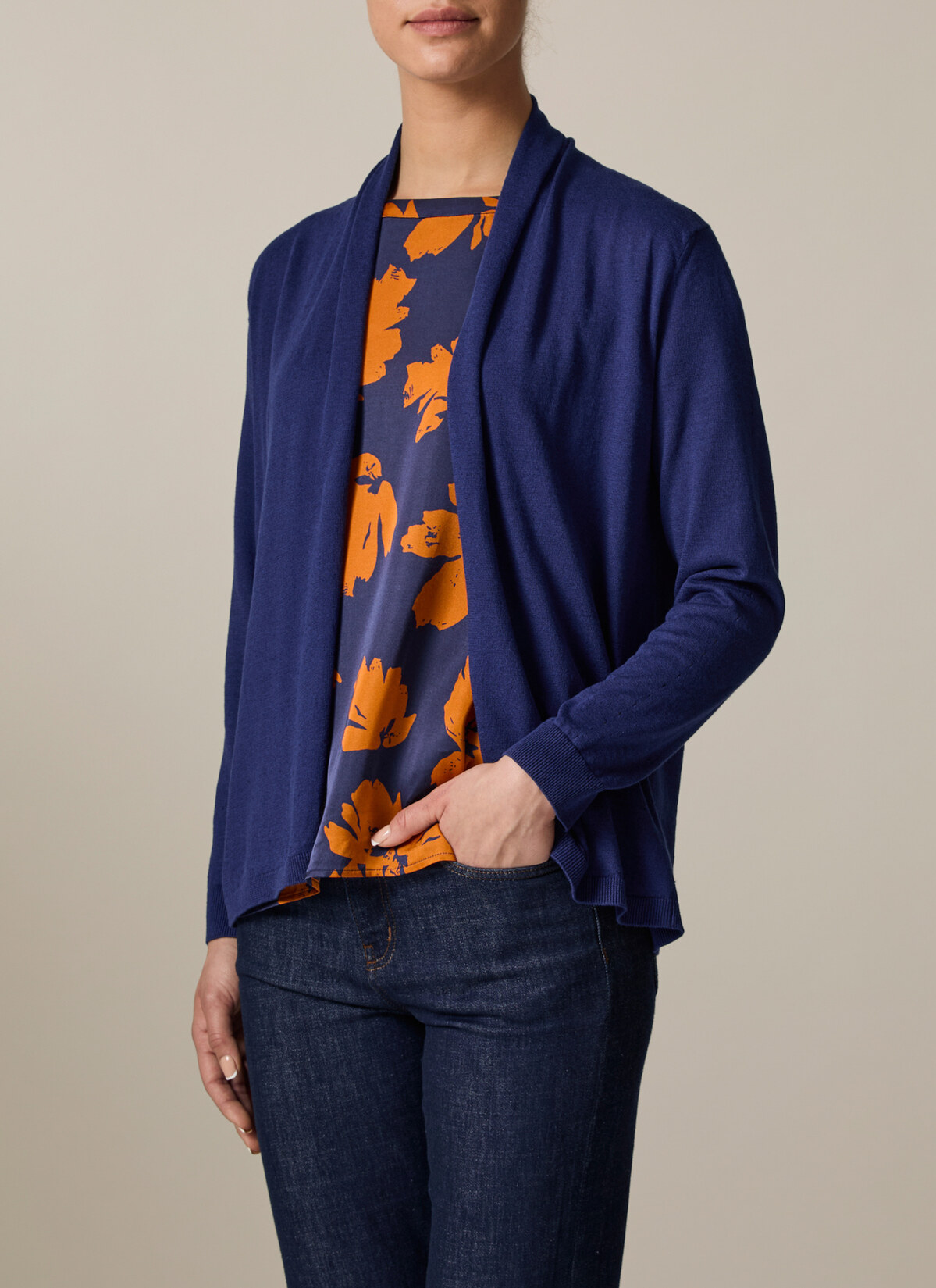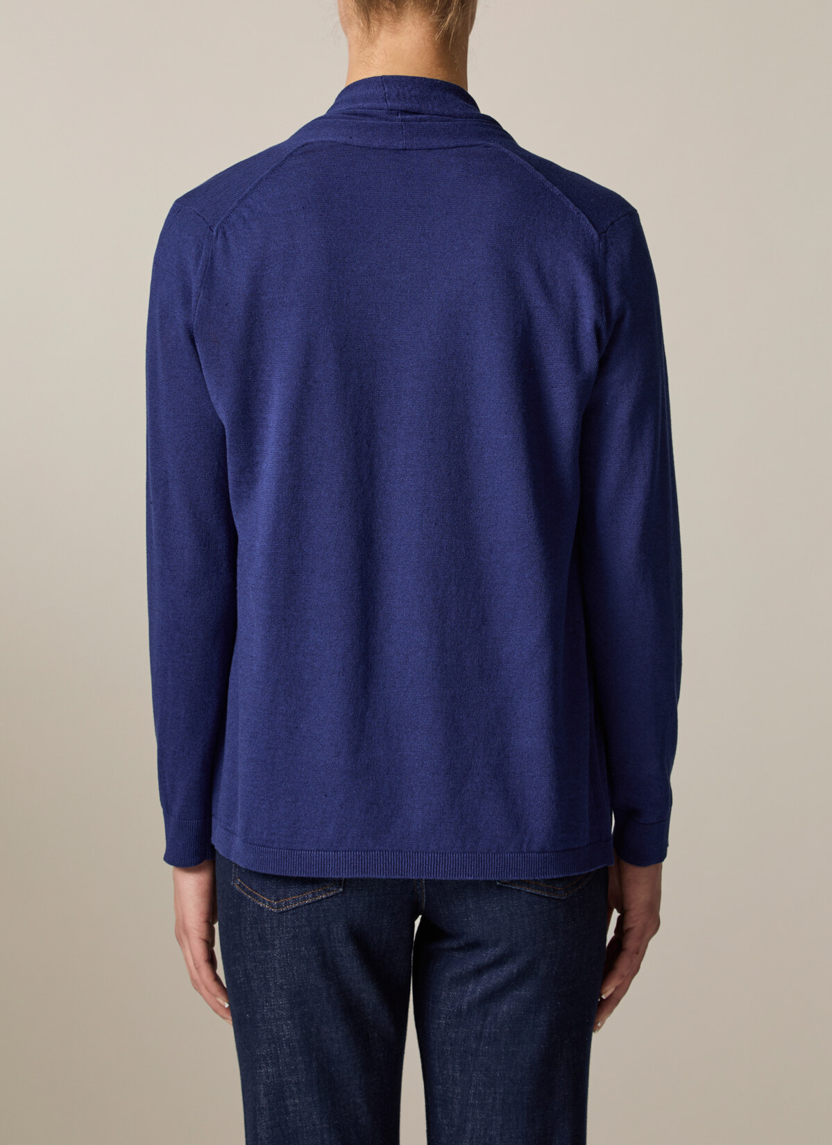 Die Strickjacke im Modern Fit zeigt sich mit einer klassischen französischen Schulter und einem offenen Schnitt ohne Knöpfe, der für eine zeitlose, schlichte Optik sorgt. Material: der Mix aus Biobaumwolle und Leinen ist besonders atmungsaktiv und bietet hohen Komfort und Nachhaltigkeit. Haptik: weich und kühl. Styling-Tipp: kombiniert mit Jeans oder einem Rock für einen entspannten, stilvollen Look.